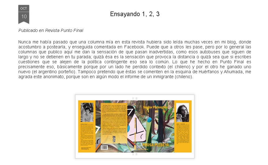 Nunca me había pasado que una columna mía en esta revista hubiera sido leída muchas veces en mi blog, donde acostumbro a postearla, y enseguida comentada en Facebook. Puede que a otros les pase, pero por lo general las columnas que publico aquí me dan la sensación de que pasan inadvertidas, como esos autobuses que siguen de largo y no se detienen en tu parada; quizá ésa es la sensación que provoca la distancia o quizá sea que si escribes cuestiones que se alejen de la política contingente eso sea lo común. Lo que he hecho en Punto Final es precisamente eso, básicamente porque por un lado he perdido contexto (el chileno) y por el otro he ganado uno nuevo (el argentino porteño). Tampoco pretendo que éstas se comenten en la esquina de Huérfanos y Ahumada, me agrada este anonimato, porque son en algún modo el informe de un inmigrante (chileno).