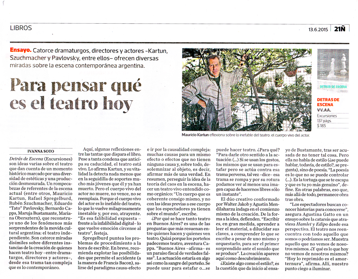 -Pese a tanta condena que anticipa su caducidad, el teatro está vivo. Lo afirma Kartun, y su vitalidad la detecta nada menos que en la seguidilla de soportes mucho más jóvenes que él y ya han muerto. Pero el cuerpo vivo del actor no muere, no vence, no se reemplaza. Porque el cuerpo vivo del actor es lo inefable del teatro, lo que lo vuelve milagrosamente inestable y, por eso, atrayente. “Es esa falibilidad expuesta –frente a la infalibilidad digital– lo que vuelve emoción circense al teatro”, festeja.