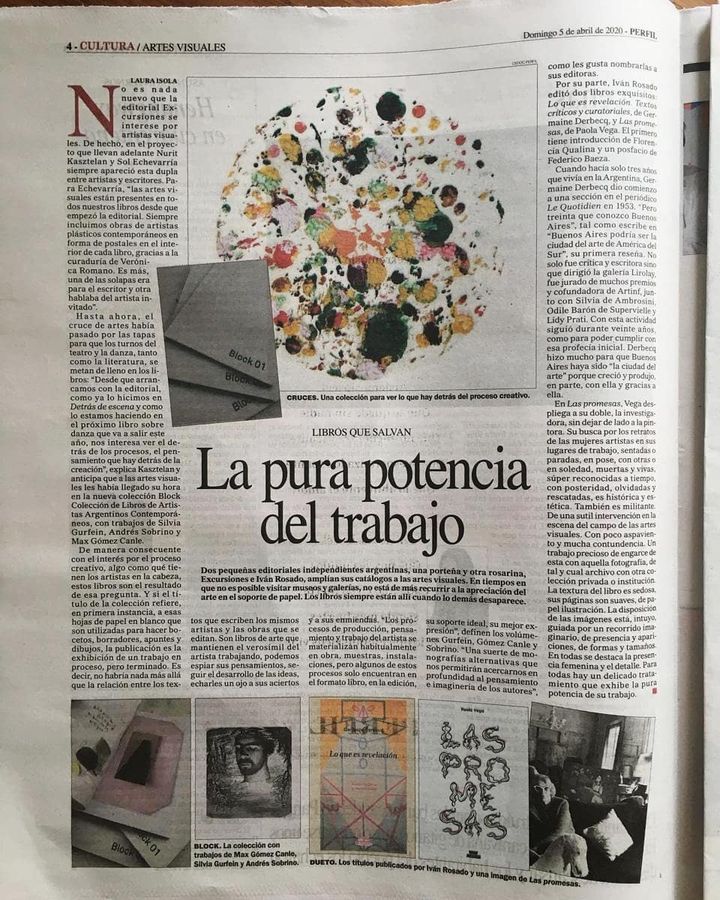 Hasta ahora, el cruce de artes había pasado por las tapas para que los turnos del teatro y la danza, tanto como la literatura, se metan de lleno en los libros: “Desde que arrancamos con la editorial, como ya lo hicimos en Detrás de escena y como lo estamos haciendo en el próximo libro sobre danza que va a salir este año, nos interesa ver el detrás de los procesos, el pensamiento que hay detrás de la creación”, explica Kasztelan y anticipa que a las artes visuales les había llegado su hora en la nueva colección Block Colección de Libros de Artistas Argentinos Contemporáneos, con trabajos de Silvia Gurfein, Andrés Sobrino y Max Gómez Canle.